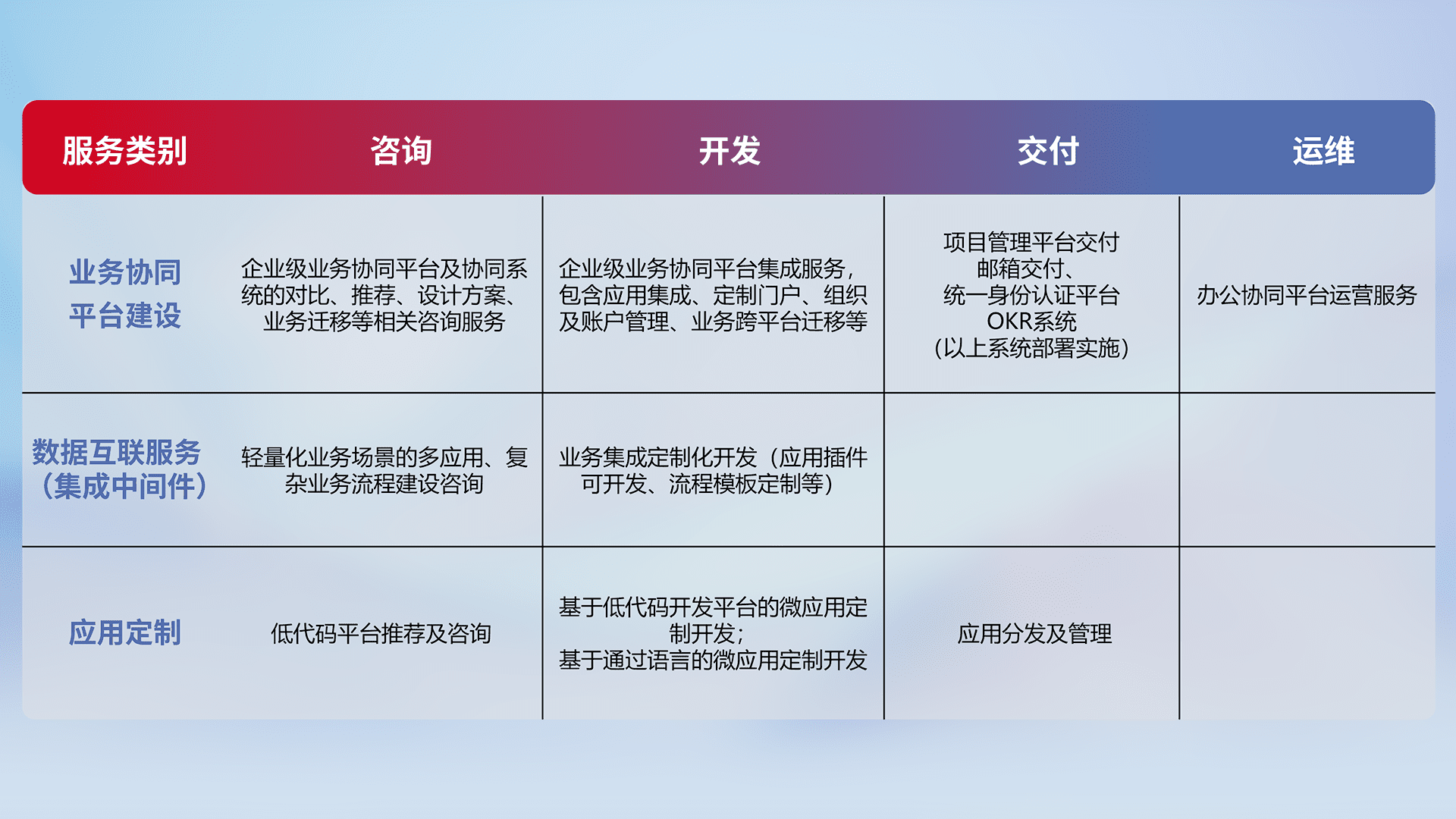 针对钉钉、、、企微、、、IDaas等平台级产品提供产品的规划、、方案、、交付、、、定制化开发等服务,,,,实现如统一协同办公、、、、智能客户服务、、、、混合会议管理、、、智能数据查询、、、等业务场景,,,,实现数字化转型。。。。