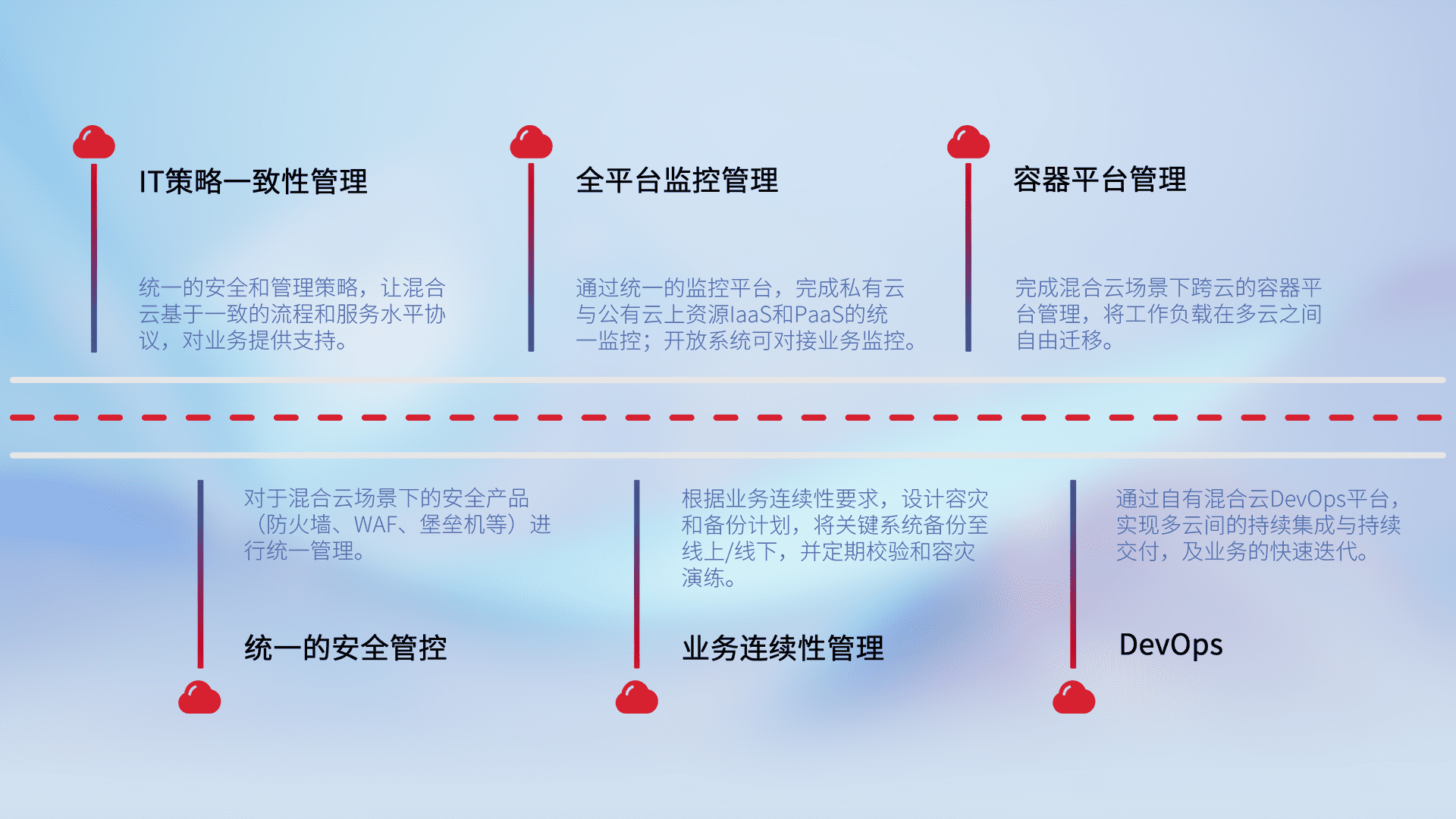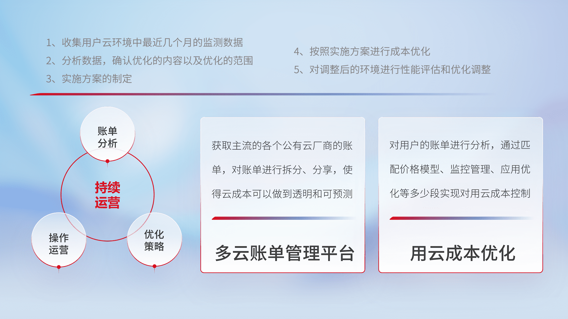 通过多云纳管,,,以统一的资源数据模型把客户的云资源进行抽象和封装,,,,进而实现对多云资源的统一操作,,保障云资源管理的可靠性、、稳定性与可用性。。量身定制化运维内容,,配置、、、开发运维、、补丁管理、、备份、、、监控、、、、认证和访问管理、、审计和日常巡检等,,保障在用云过程中的可靠度,,,,稳定度以及高可用率。。