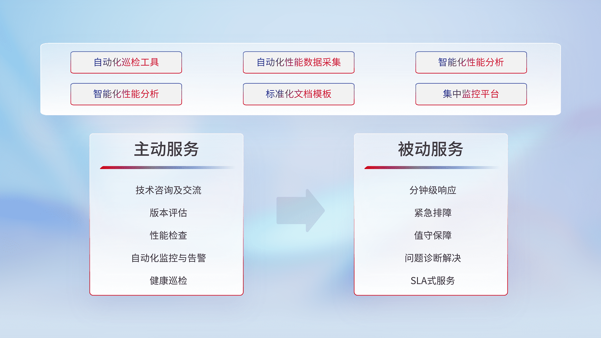 智能化工具和标准化文档,,保障服务质量,,,,提供主动服务(包含技术咨询、、、、版本评估、、性能检查、、自动化监控与告警、、健康巡检)和被动服务包含(分钟级响应、、、紧急排障、、值守保障、、、问题诊断解决、、SLA服务)。。。。