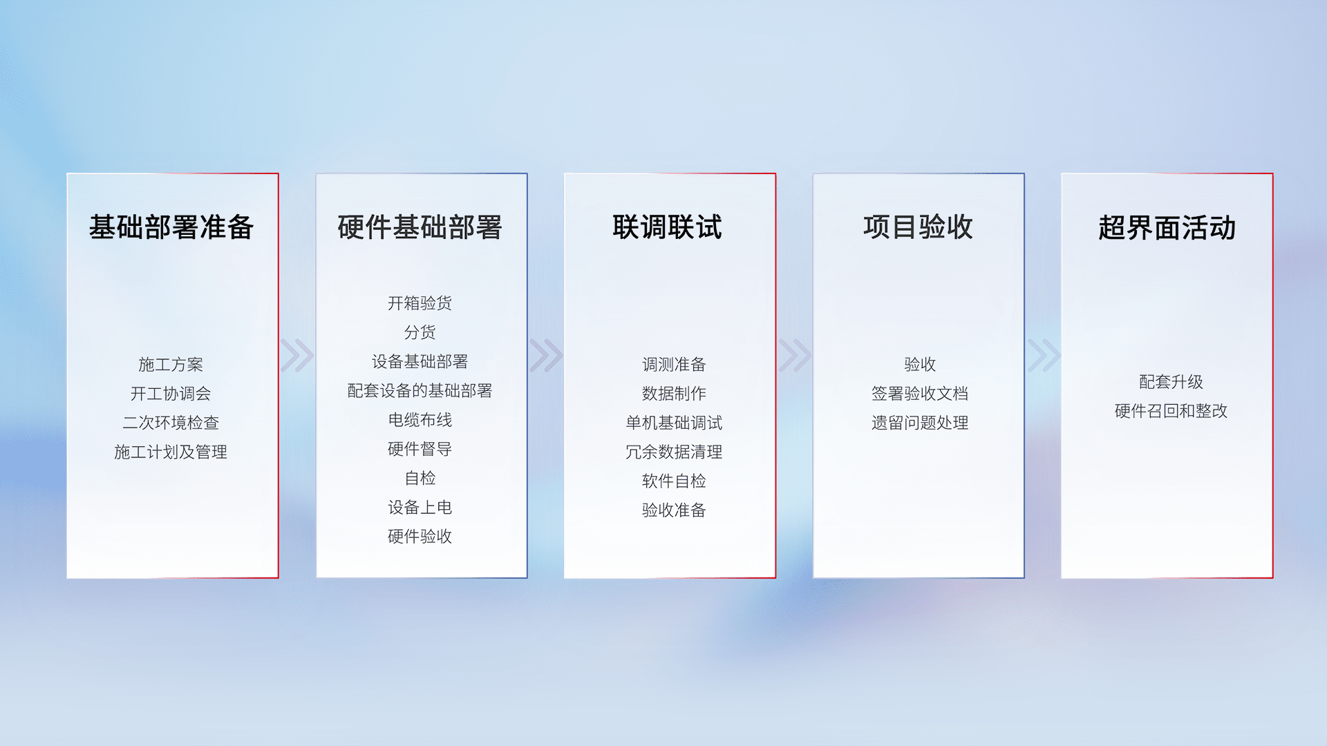 从基础部署准备、、、硬件基础部署、、、联调联试、、项目验收、、越界面活动的全过程可追溯,,,保证施工质量和进度。。。